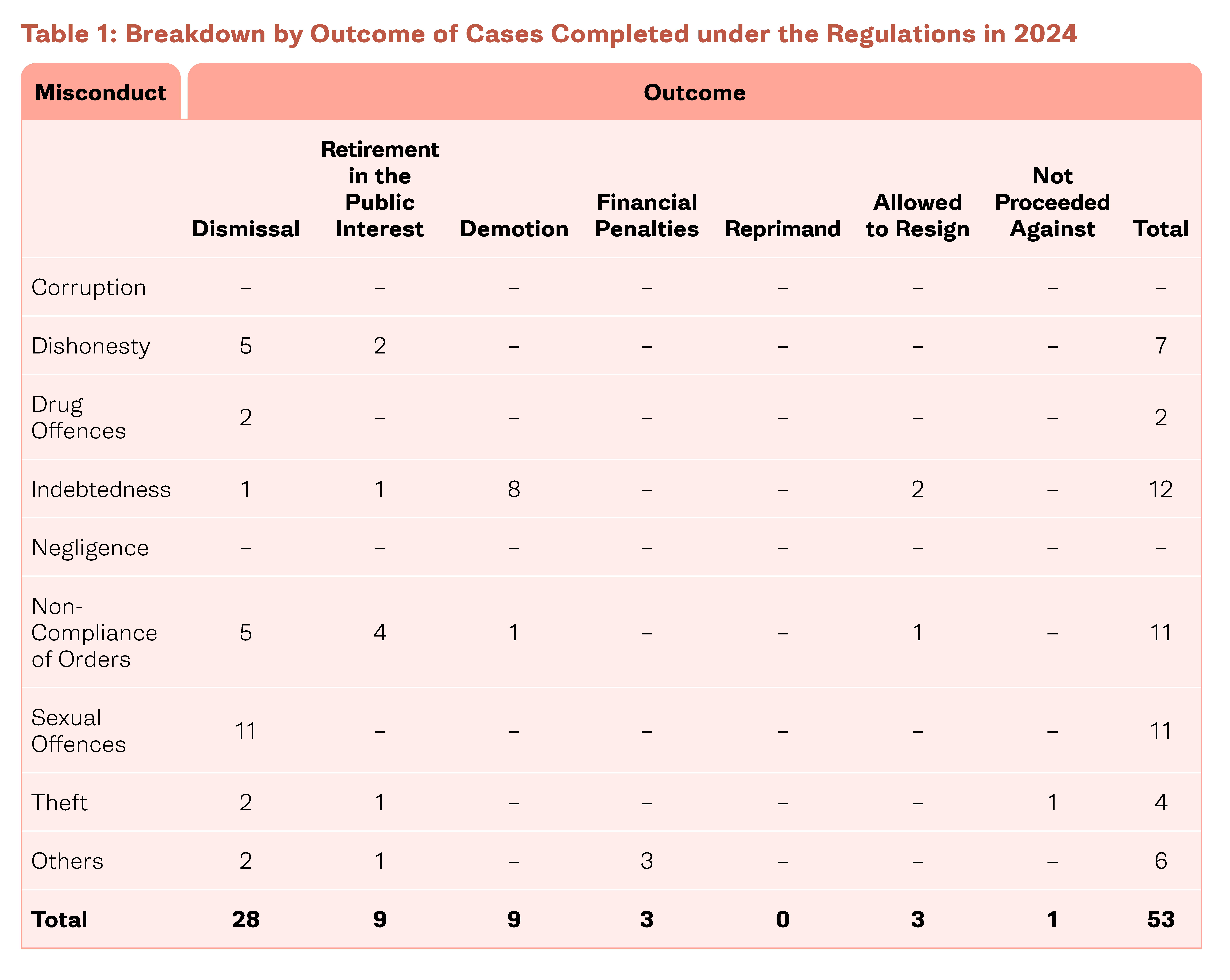A total of 151 new disciplinary cases were reported to the PSC in 2024. Together with 83 cases that were brought forward from previous years, the PSC processed a total of 234 cases in the year. 158 cases (68%) were completed. Of these completed cases, 53 cases were completed under the Regulations, 92 cases were completed under the Directions, and no formal disciplinary action was instituted against the officers in the remaining 13 cases.