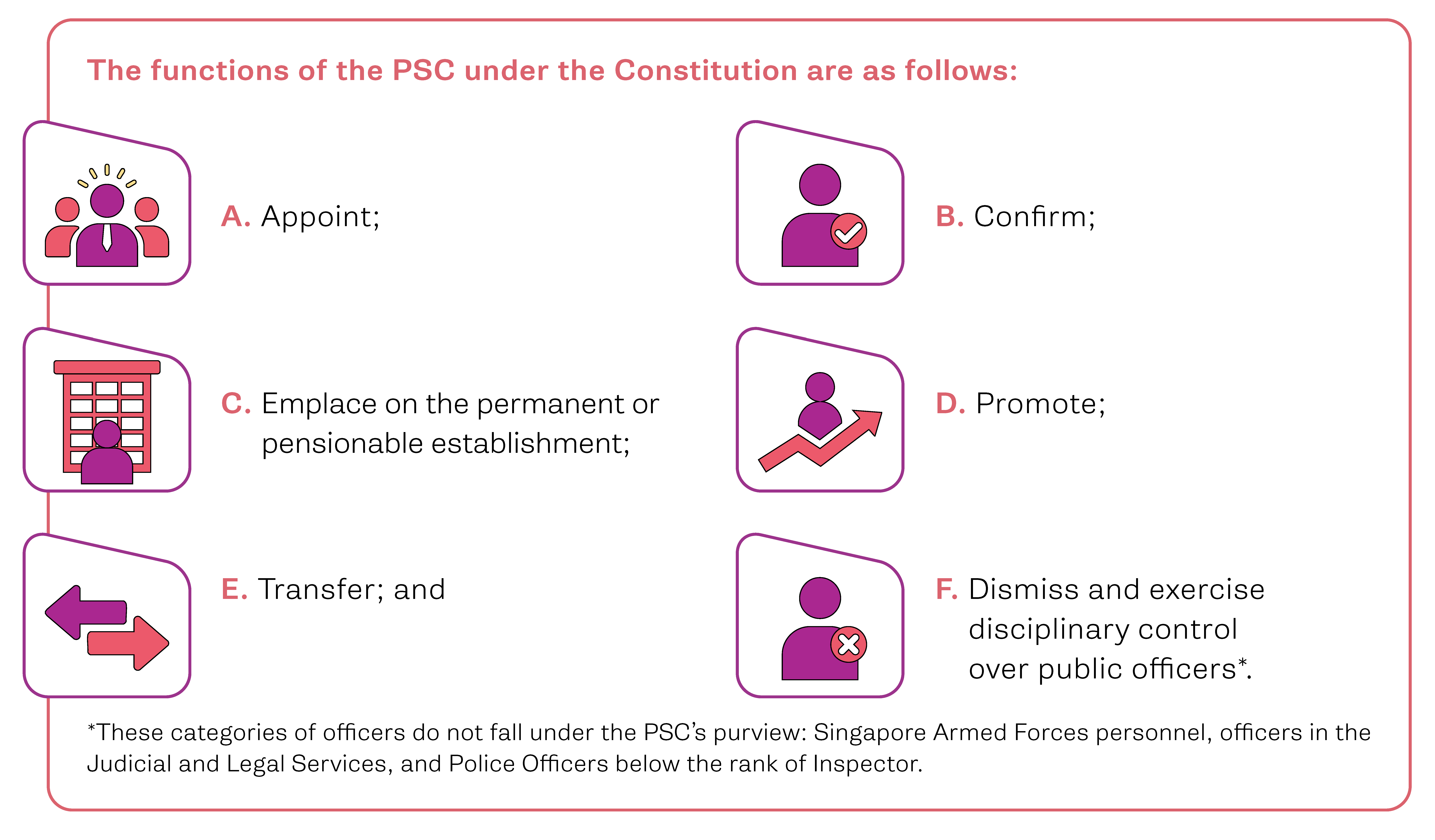 Under the Public Sector (Governance) Act 2018 which came into effect on 1 April 2018, the PSC’s concurrence is required for the appointment, promotion and discipline of Chief Executive Officers of Statutory Boards.